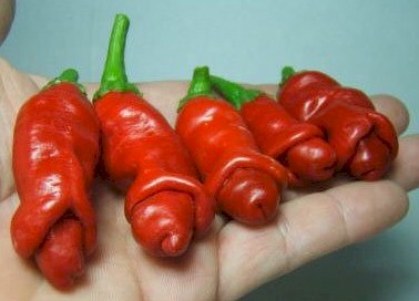 Faut il vraiment en dire plus sur ce piment à la forme équivoque, et qui de plus est très fort (Ses gammes de niveau de chaleur sont entre 5.000 et 30.000 unités Scoville, l'unité de mesure de la puissance piquante d'un piment). Plus costaud que le tabasco! Pour rassurer ces messieurs, ce piment ne mesure que 4 à 5 cm. La preuve que ce n'est pas la taille qui compte.